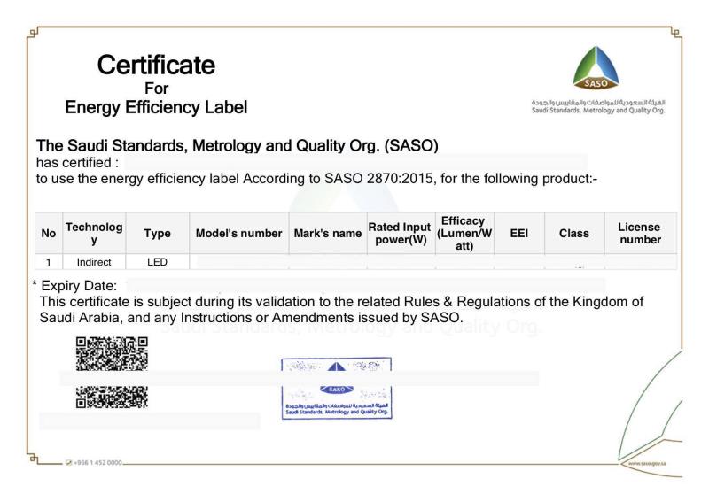 上海那尔,为可以办理好的SASO2870灯泡能效注册证书样本,如下图所示: